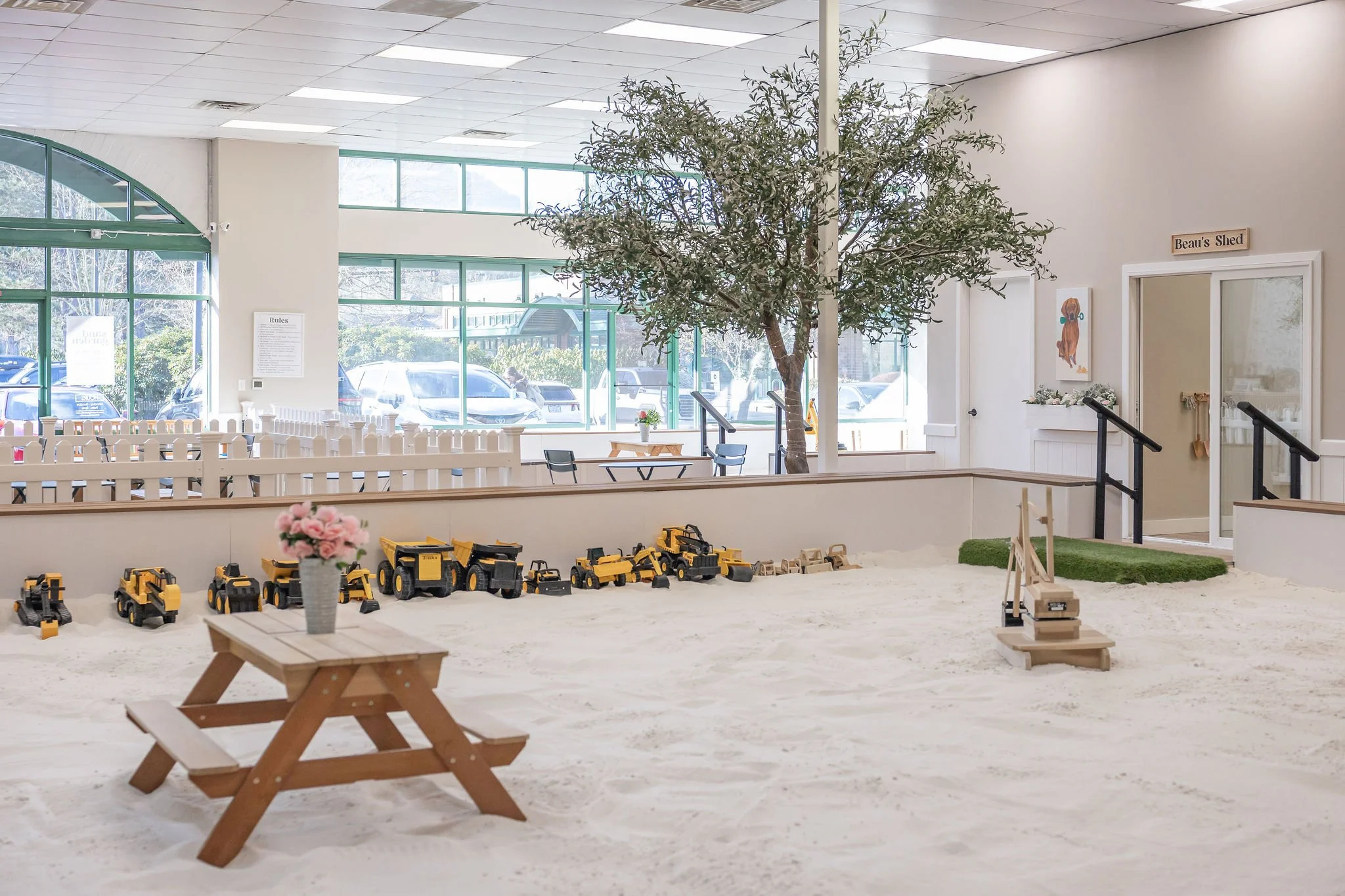 • Shoes, socks, outside toys, and food/drinks are kept out of the sand