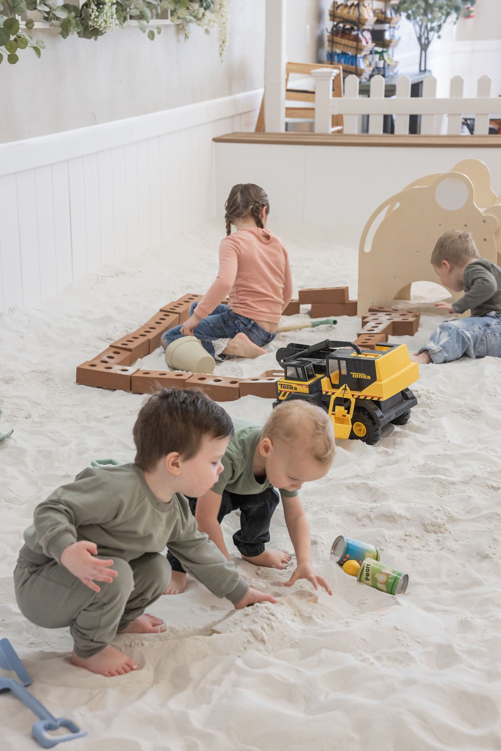 Our team actively maintains the sand throughout the day to keep it clean and inviting. The sand is raked daily to remove any debris and is wet down to help reduce dust. Several times a week, we treat the sand with a child-safe water-and-vinegar solution to help keep it clean.